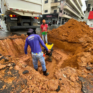 No centro da cidade, em frente à antiga Napolitana, as equipes utilizam uma retroescavadeira para escavação do solo, removendo grande volume de terra que é depositado sobre a pista. Além disso, há a presença de caminhão basculante para remoção do material escavado. Sobre a cratera no local, Alves explicou: “Tivemos esse problema no começo do ano e agora abriu novamente. Estamos fazendo um serviço paliativo, mas no verão será construída a galeria definitiva para evitar que o problema volte.”